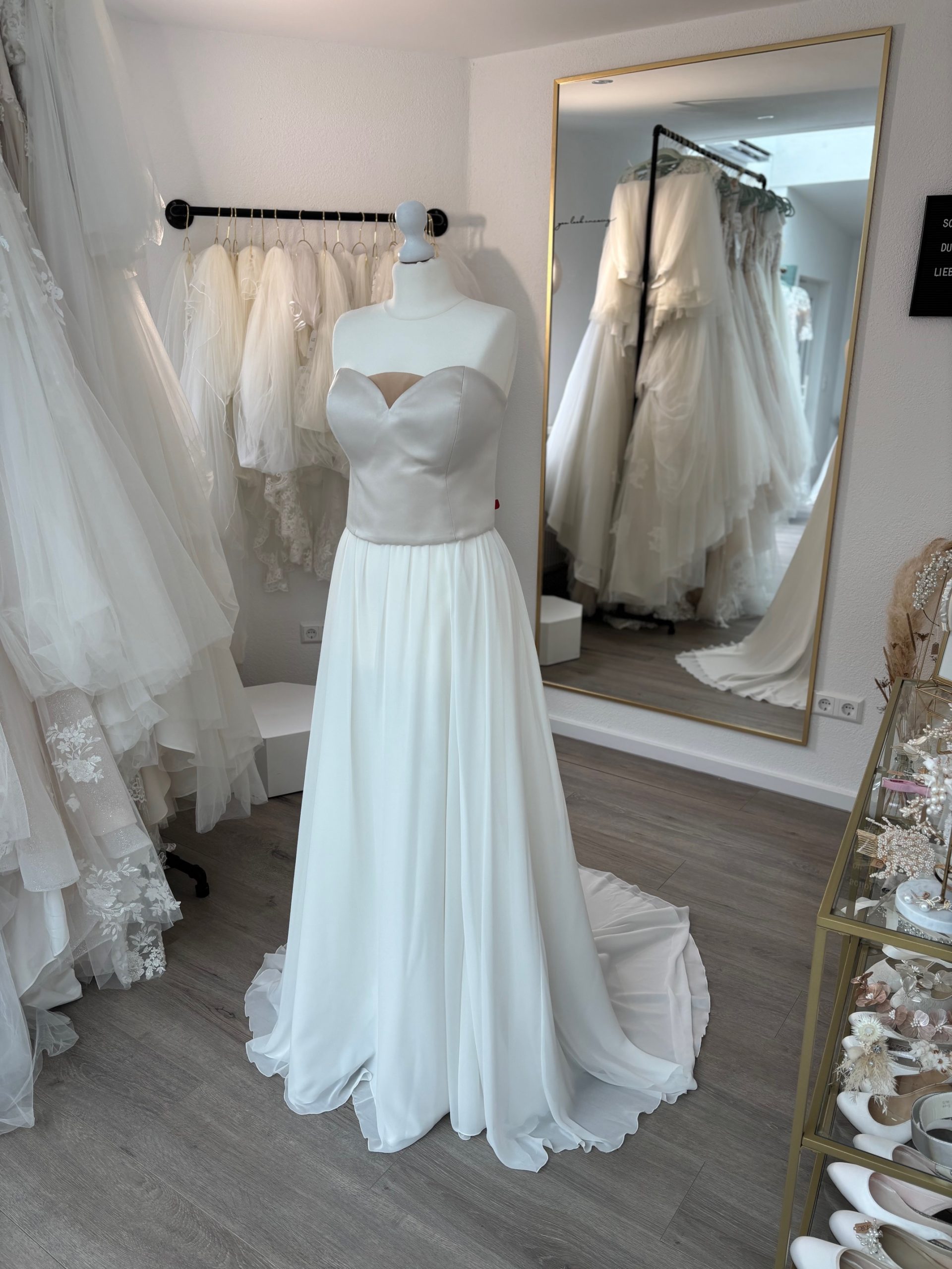 Entdecke unsere ansprechende Kollektion von Standesamtkleidern! Tauche ein in eine Welt voller subtiler Eleganz und zeitloser Schönheit, die deinen besonderen Moment perfekt ergänzen. Unsere Auswahl an Standesamtkleidern bietet eine breite Palette von Designs, von schlichter Raffinesse bis hin zu moderner Grazie. Von fließenden Linien bis hin zu zarten Details bieten wir vielfältige Optionen, die deinem individuellen Stil Ausdruck verleihen. Komm zu uns nach Schorndorf, um diese zauberhaften Kleider hautnah zu erleben. Jedes Detail wurde mit Sorgfalt ausgewählt, um deine Persönlichkeit in jedem Moment zu unterstreichen. Finde dein perfektes Standesamtkleid und trete mit Selbstvertrauen in den Mittelpunkt deines besonderen Tages. Genieße den unvergleichlichen Charme von Standesamtkleidern, die deinen Anlass auf zauberhafte Weise bereichern.